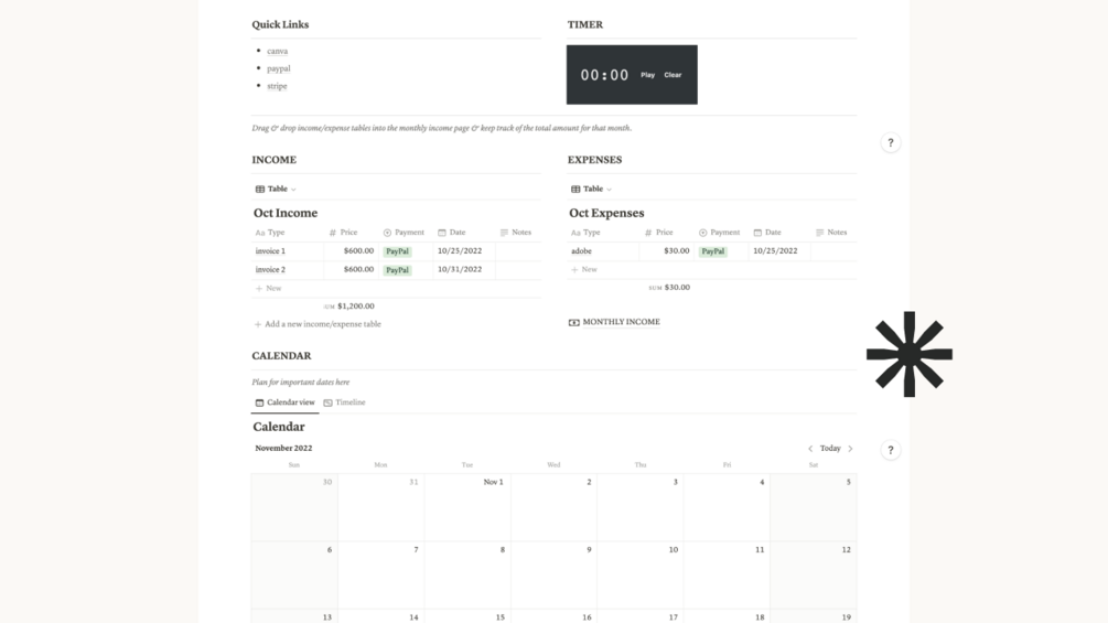 Track income & expenses for the month with databases & plan out your entire month with the calendar.